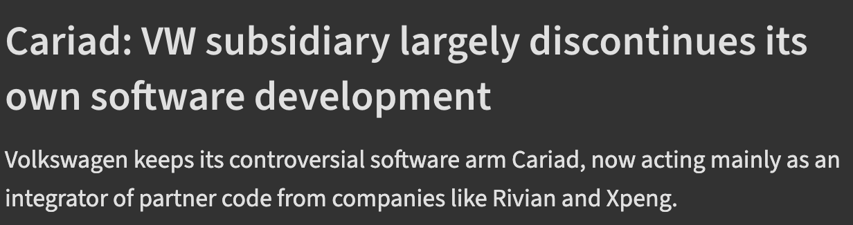In the end, Volkswagen pulled the emergency brake. Instead of continuing to develop its own platform, the Group is now increasingly relying on external partners like Rivian, gradually demoting Cariad to a mere integrator of third-party software.