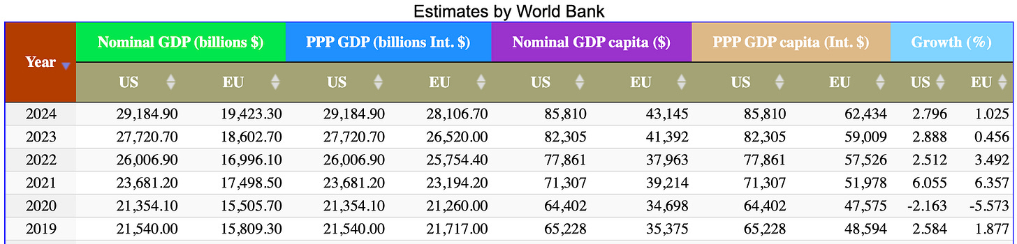 This imbalance continues relentlessly in the economic sphere. In 2024 and 2023, EU GDP growth stood at 1.025% and 0.456%, while the US GDP, with growth rates of 2.797% and 2.888%, continues to pull further and further ahead of Europe.
