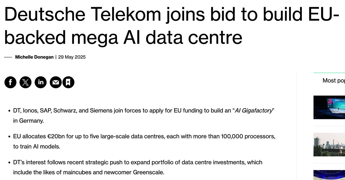 - In Europe, investments of €1bn in data centers are celebrated as milestones by the media and politicians alike. The European Commission proudly announces investments of €307mn in AI and related technologies. But these are peanuts. They do absolutely nothing to move the needle in the right direction. When it comes to data centers, the EU has to push companies to invest €20bn in five large-scale facilities. And this is being framed as a success. €20bn. Sounds like a lot. But in the end, Amazon and Microsoft spent roughly ten times(!) that on CapEx last year.